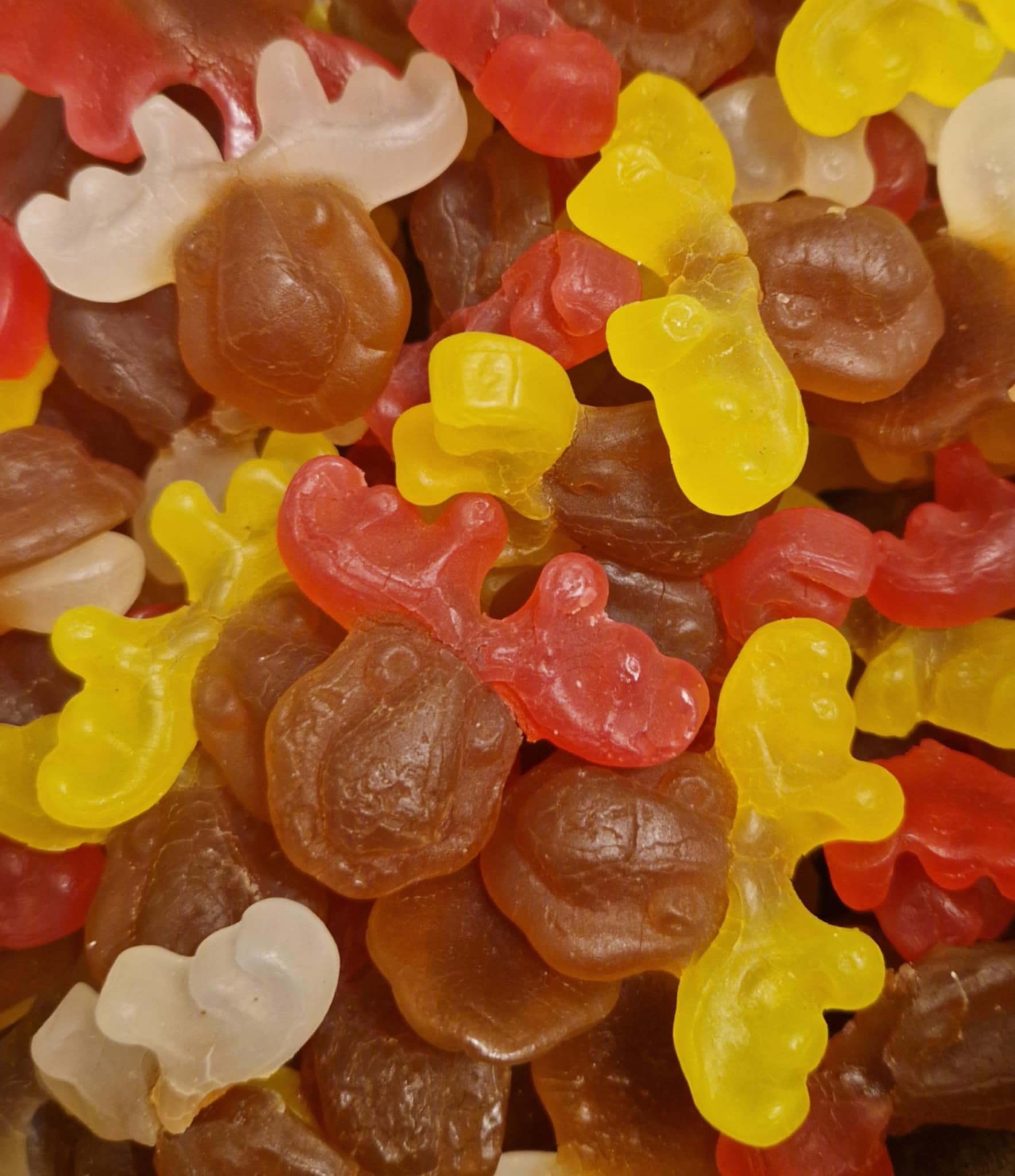 Delicious cola and fruit flavoured gummy sweets in a festive reindeer shape.